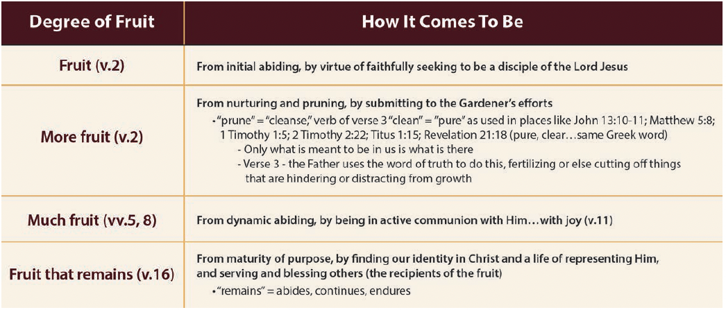 The secret to such growth is to focus on our responsibility—abiding—rather than on the fruit itself. The word “abide,” whether used as a verb or a noun, appears nearly 20 times in John 14 and 15, including John 14:2, which states, “In my Father’s house there are many abodes.” (Darby) By abiding, we are passive and dependent, because the fruit is produced by the Vine and the Gardener, not by us. Yet, this process is also active and intentional (2 Pet. 1:3–11), as we must prioritize our connection to the Vine and cooperate to ensure there is an unhindered flow of the life of the Vine through us. Only then can we be confident that mature fruit will appear and yield ongoing, high-quality harvests.